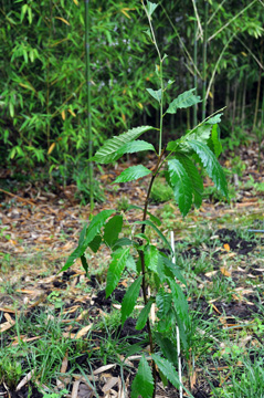 As an iconic tree, they still have friends and admirers today. Researchers have been laboring to create a transgenic chestnut and hybrids that are blight resistant from backcrossing and intercrossing to incorporate genes that were evolved by the Chinese chestnut over eons for protection where the blight was endemic. The latest generation of Restoration Chestnut from the American Chestnut Foundation is nearly 95% American and groves of them are being planted in Virginia and other eastern states. I care for one I planted in my yard last year from seed. Will it survive? Only time will tell. But blight is not the only threat—a marauding deer munched its crown last week.