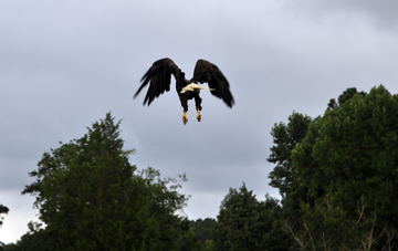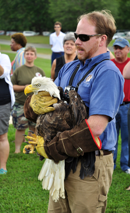 Almost two hundred people gathered at York River State Park for the arrival of the veterinary director from the Wildlife Center in Waynesboro. He was returning a V.I.B. to her home in the Coastal Plain of Virginia. Two months earlier, a park ranger found her lying sodden on the ground and unable to fly. After passing through the care of a licensed “rehabber,” she was passed to the Center for a physical exam, X-rays, blood tests, and rehabilitation.