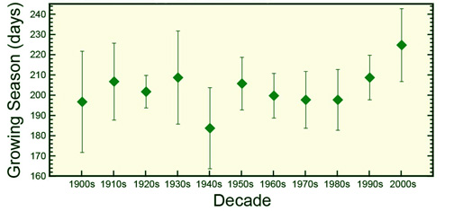Length of growing season in Williamsburg, VA (+/-1 S.D.)